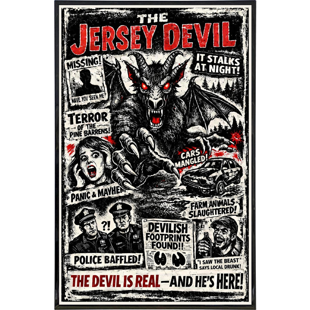 We’ve all seen the grainy photos and heard the "friend of a friend" stories. This print captures the chaotic energy of a true Jersey Devil sighting, wrapped in the style of a gritty, vintage tabloid.